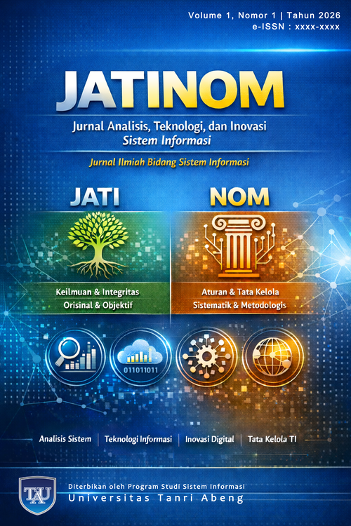 JATINOM (Jurnal Analisis, Teknologi, dan Inovasi Sistem Informasi) merupakan jurnal ilmiah yang mempublikasikan hasil penelitian, kajian konseptual, dan pengembangan terapan di bidang Sistem Informasi. Jurnal ini menjadi wadah diseminasi karya ilmiah yang berfokus pada analisis sistem, penerapan teknologi informasi, serta inovasi digital yang mendukung pengambilan keputusan, peningkatan kinerja organisasi, dan transformasi digital.