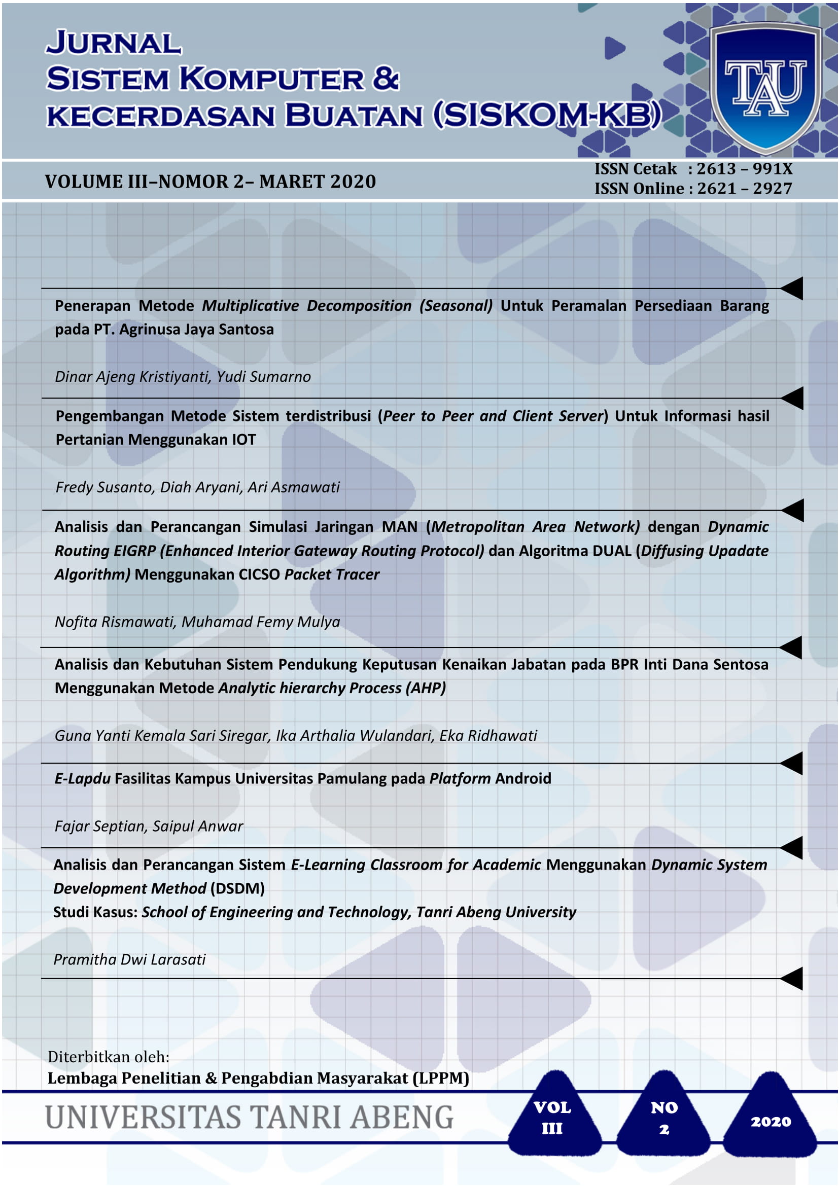 Vol. 1 No. 2 (2018)Jurnal SISKOM-KB (Sistem Komputer dan Kecerdasan Buatan) is a journal managed and published by the LPPM office of Tanri Abeng University and compiled by program study of Informatics Engineering, under Faculty of Engineering Tanri Abeng University. Journal of SISKOM-KB is published for lecturers and researchers who have scientific works related to the topic of computer systems in general and computer systems that use artificial intelligence algorithms. The SISKOM-KB journal is a periodical journal that will be published twice a year in the January and September editions. Going forward, we hope the journal of SISKOM-KB will be able to reach more readers and contributors.